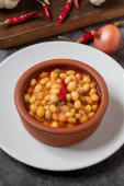 Gorący turecki gulasz fasolowy na niebieskim tle. Fasola ispir gotowana w zapiekance - Kuru Fasulye