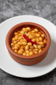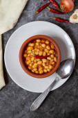 Gorący gulasz z fasoli tureckiej na ciemnym tle. Fasola ispir gotowana w zapiekance - Kuru Fasulye