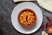 Gorący gulasz z fasoli tureckiej na ciemnym tle. Fasola ispir gotowana w zapiekance - Kuru Fasulye. Widok z góry