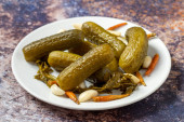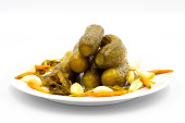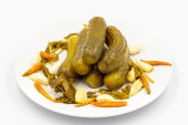 Zdjęcie "Marynowane ogórki na białym tle. Zbliżenie ogórków marynowanych w płycie ceramicznej. Zamknij się. Widok z góry" może być wykorzystywane do celów osobistych i komercyjnych zgodnie z warunkami zakupionej licencji Royalty-free. Obraz jest dostępny do pobrania w jakości wysokiej rozdzielczości do 5760x3840.