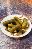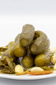 Marynowane ogórki na białym tle. Zbliżenie ogórków marynowanych w płycie ceramicznej. Zamknij się. Widok z góry