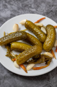 Marynowane ogórki na zardzewiałym tle żelaza. Zbliżenie ogórków marynowanych w płycie ceramicznej. zbliżenie