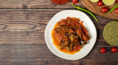 Pasta chili na drewnianym tle. pikantna pasta. Rodzaj adżiki. Przystawki z kuchni tureckiej. Widok poziomy. Zamknij się.