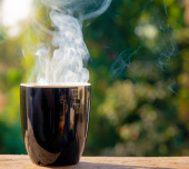 Niewyraźny ruch pary nad metalowym kubkiem. Odparowywanie cieczy. Efekt tęczy.