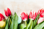Wiosna wakacje kartka okolicznościowa tło z różnym kolorem kwiatów tulipan, pudełko z prezentami, płaskie na jasnoniebieskim wysokim kolorze drewniane tło widok z góry kopia przestrzeń