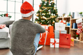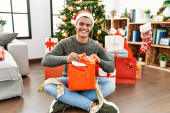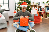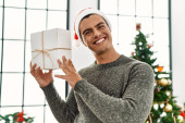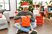 Młody Hiszpan rozpakowuje prezent siedząc przy choince w domu