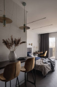 Zdjęcie "Nowoczesna, mała i funkcjonalna kuchnia w korytarzu stylowego apartamentu typu studio" może być wykorzystywane do celów osobistych i komercyjnych zgodnie z warunkami zakupionej licencji Royalty-free. Obraz jest dostępny do pobrania w jakości wysokiej rozdzielczości do 5760x3840.