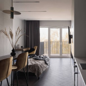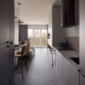 Nowoczesna, mała i funkcjonalna kuchnia w korytarzu stylowego apartamentu typu studio
