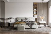 Zdjęcie "Elegancka sypialnia z dużym i wygodnym łóżkiem ze stylową pościelą z widokiem na nowoczesną kabinę prysznicową ze szklaną ścianą" może być wykorzystywane do celów osobistych i komercyjnych zgodnie z warunkami zakupionej licencji Royalty-free. Obraz jest dostępny do pobrania w jakości wysokiej rozdzielczości do 5760x3840.