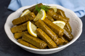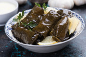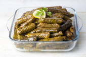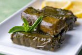Pyszna dolma, wypchane liście winogron, ryż, sos z białego jogurtu. Libańska sarma na talerzu. Liban turecki grecki kuchnia bliskowschodnia