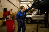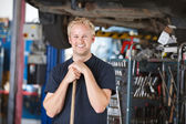 Portret młodego mechanika w profesjonalnym mundurze, trzymającego klucz i pracującego w serwisie samochodowym z podnoszonym pojazdem, uśmiechającego się uśmiechniętym uśmiechem patrzącego w kamerę. Naprawa i konserwacja samochodów.