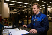 Zdjęcie "Portret młodego mechanika w profesjonalnym mundurze, trzymającego klucz i pracującego w serwisie samochodowym z podnoszonym pojazdem, uśmiechającego się uśmiechniętym uśmiechem patrzącego w kamerę. Naprawa i konserwacja samochodów." może być wykorzystywane do celów osobistych i komercyjnych zgodnie z warunkami zakupionej licencji Royalty-free. Obraz jest dostępny do pobrania w jakości wysokiej rozdzielczości do 5760x3840.