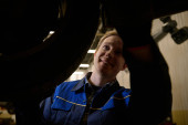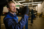 Zdjęcie "Pewny siebie profesjonalny portret przystojnego mechanika samochodowego w mundurze uśmiechniętego z uśmiechem na ustach, stojącego w garażu serwisowym z podnoszonym samochodem w tle. Koncepcja naprawy i konserwacji samochodów." może być wykorzystywane do celów osobistych i komercyjnych zgodnie z warunkami zakupionej licencji Royalty-free. Obraz jest dostępny do pobrania w jakości wysokiej rozdzielczości do 5760x3840.
