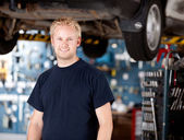 Pewny siebie profesjonalny portret przystojnego mechanika samochodowego w mundurze uśmiechniętego z uśmiechem na ustach, stojącego w garażu serwisowym z podnoszonym samochodem w tle. Koncepcja naprawy i konserwacji samochodów.