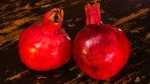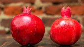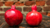 Na stole leżały dwa czerwone granaty. Dwa dojrzałe granat na stole na tle czerwonej cegły ściany. Zdrowe jedzenie. Koncepcja martwej natury.