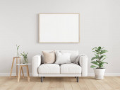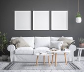 Wnętrze salonu z sofą, rośliną i stołem kawowym. Dwie fotomontaże na ścianie. Renderowanie 3D. 3D ilustracja.