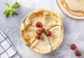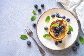 Zdjęcie "Rosyjski ukraiński święto europejskie Maslenitsa. Tradycyjne naleśniki z cienkimi naleśnikami, z jagodami, dżemem i miodem na drewnianym niebieskim stole, przestrzeń do kopiowania z widokiem z góry" może być wykorzystywane do celów osobistych i komercyjnych zgodnie z warunkami zakupionej licencji Royalty-free. Obraz jest dostępny do pobrania w jakości wysokiej rozdzielczości do 5760x3840.