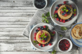 Rosyjski ukraiński święto europejskie Maslenitsa. Tradycyjne naleśniki z cienkimi naleśnikami, z jagodami, dżemem i miodem na drewnianym niebieskim stole, przestrzeń do kopiowania z widokiem z góry