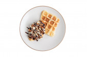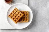 Świeżo upieczone belgijskie gofry na białym talerzu i szklanka mleka na jasnym stole, smaczne śniadanie, widok z góry
