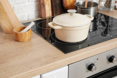 Czerwony garnek na kuchence elektrycznej w kuchni. Przybory kuchenne