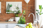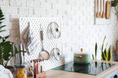 Zdjęcie "Drewniany blat z kuchenką mikrofalową i pegboard z naczyniami na lekkiej ścianie w kuchni" może być wykorzystywane do celów osobistych i komercyjnych zgodnie z warunkami zakupionej licencji Royalty-free. Obraz jest dostępny do pobrania w jakości wysokiej rozdzielczości do 5760x3840.