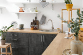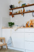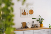Drewniany blat z kuchenką mikrofalową i pegboard z naczyniami na lekkiej ścianie w kuchni