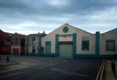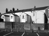 monochromatyczny obraz pustej ulicy pełnej opuszczonego budynku pod ciemnym zachmurzonym niebem