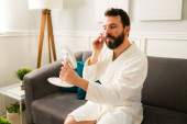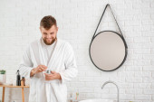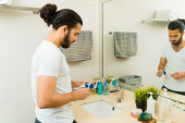 Zdjęcie "Tylny widok mężczyzny używającego serum i produktów do pielęgnacji skóry podczas kręcenia filmu za pomocą smartfona i lampki pierścieniowej" może być wykorzystywane do celów osobistych i komercyjnych zgodnie z warunkami zakupionej licencji Royalty-free. Obraz jest dostępny do pobrania w jakości wysokiej rozdzielczości do 5760x3840.