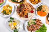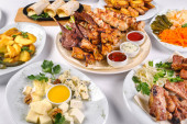 Pokryty stół z wieloma różnymi daniami. Dużo jedzenia na białym, izolowanym tle..