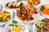 Zdjęcie "Pokryty stół z wieloma różnymi daniami. Dużo jedzenia na białym, izolowanym tle.." może być wykorzystywane do celów osobistych i komercyjnych zgodnie z warunkami zakupionej licencji Royalty-free. Obraz jest dostępny do pobrania w jakości wysokiej rozdzielczości do 5760x3840.