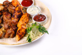 Pokryty stół z wieloma różnymi daniami. Dużo jedzenia na białym, izolowanym tle..