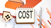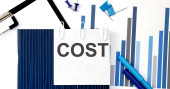 Tekst COST na drewnianym bloku na klawiaturze, koncepcja biznesu