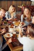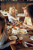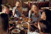 Szczęśliwy wielokulturowe kobiety przyjaciele posiadające imprezę w domu i jedzenia pizzy.