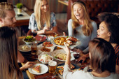Zdjęcie "Szczęśliwy wielokulturowe kobiety przyjaciele posiadające imprezę w domu i jedzenia pizzy." może być wykorzystywane do celów osobistych i komercyjnych zgodnie z warunkami zakupionej licencji Royalty-free. Obraz jest dostępny do pobrania w jakości wysokiej rozdzielczości do 5760x3840.