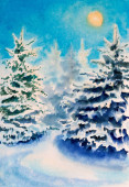Stylizowany krajobraz leśny z księżycem i płatkami śniegu w scenie nocnej. Ręcznie rysowane akwarele na papierowej fakturze. Raster bitmap obrazu