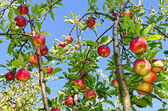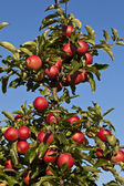 gałęzie drzewa pełne czerwonych jabłek przeciw błękitne niebo.