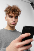 przystojny facet patrząc na telefon moda styl życia bez zmian