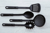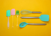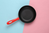 Patelnia grillowa i drewniana łopatka na niebieskim różowym pastelowym tle