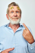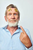 Portret szczęśliwego seniora w niebieskiej koszuli bitcoins na twarzy przycięty widok