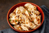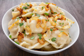 gotowane pierogi z nadzieniem i sosem na talerzu. Para na talerzu