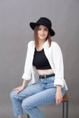 Portret młodej kobiety w białej bluzce, białej czapce i dżinsach w pobliżu niebieskiego krzesła na brązowym tle. ładny portret kobiety