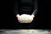Pachnące ciabatta w rękach kobiet, pomysł na fotografię żywności. Czarne tło do pieczenia.