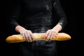 Kobiece ręce łamią bagietkę. Izolacja na czarnym tle.