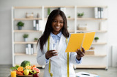 Zdjęcie "Wesoły afrykański amerykański dietetyk żeński z referatami tworzącymi plan posiłków roślinnych dla pacjenta w klinice" może być wykorzystywane do celów osobistych i komercyjnych zgodnie z warunkami zakupionej licencji Royalty-free. Obraz jest dostępny do pobrania w jakości wysokiej rozdzielczości do 5760x3840.