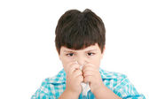 Piękny chłopiec w czerwonym swetrze stojący na białym tle i pachnący czymś śmierdzącym i obrzydliwym. Nieprzyjemny zapach