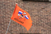 Pomarańczowe słodycze z holenderską flagą z okazji Dnia Króla 27 kwietnia. Pomarańcza to kolor narodowy w Holandii