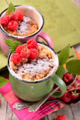 Ciepłe ciasto czekoladowe w kubku posypane cukrem pudrem