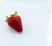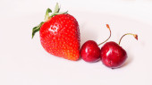 Widok z góry czerwona truskawka i dwa mokre czereśnie na białym tle. Miejsce na tekst. Koncepcja projektu.