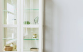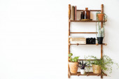 Drewniany stojak z elementami dekoracyjnymi stoi na tle betonowej ściany. Garnek z zieloną rośliną jest na pierwszym planie. Minimalizm we wnętrzu