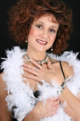 dziewczyna z różowej sukience i biały boa pozowanie na fioletowy